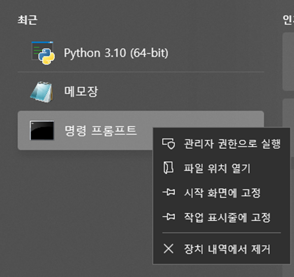 1) 윈도우 검색창에서 '명령 프롬프트'를 관리자 권한으로 실행합니다.