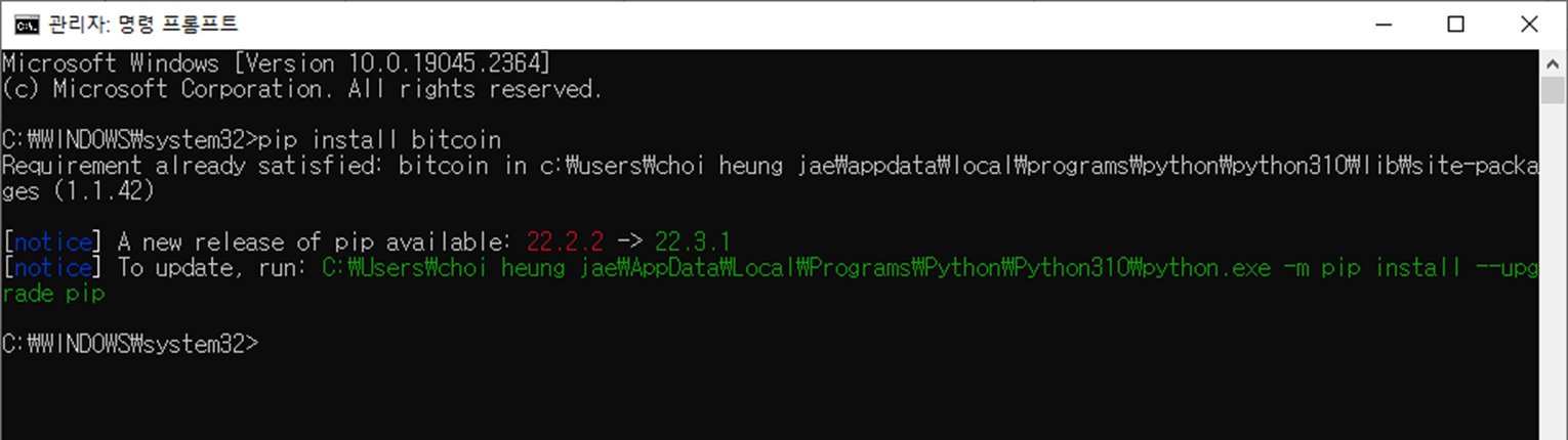 2) ‘Pip install bitcoin’ 명령어를 입력하면 라이브러리가 설치됩니다.