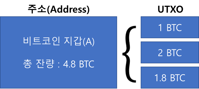 비트코인 지갑은 잔액이라는 개념이 존재하질 않습니다. 따라서 트랜잭션에 따라 생겨나는 UTXO데이터의 합이 잔액이나 마찬가지입니다. 즉 아래 그림처럼 지갑 하나에는 많은 UTXO에 각각 비트코인이 담겨있습니다.