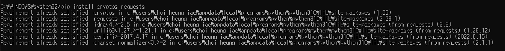 - 아래 코드에서 requests 모듈을 직접 사용하진 않지만, cryptos 내부적으로 requests를 사용하므로 사전 설치가 필요.